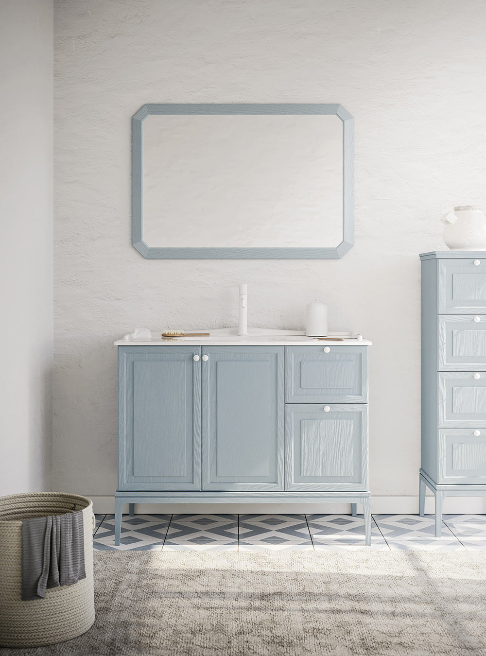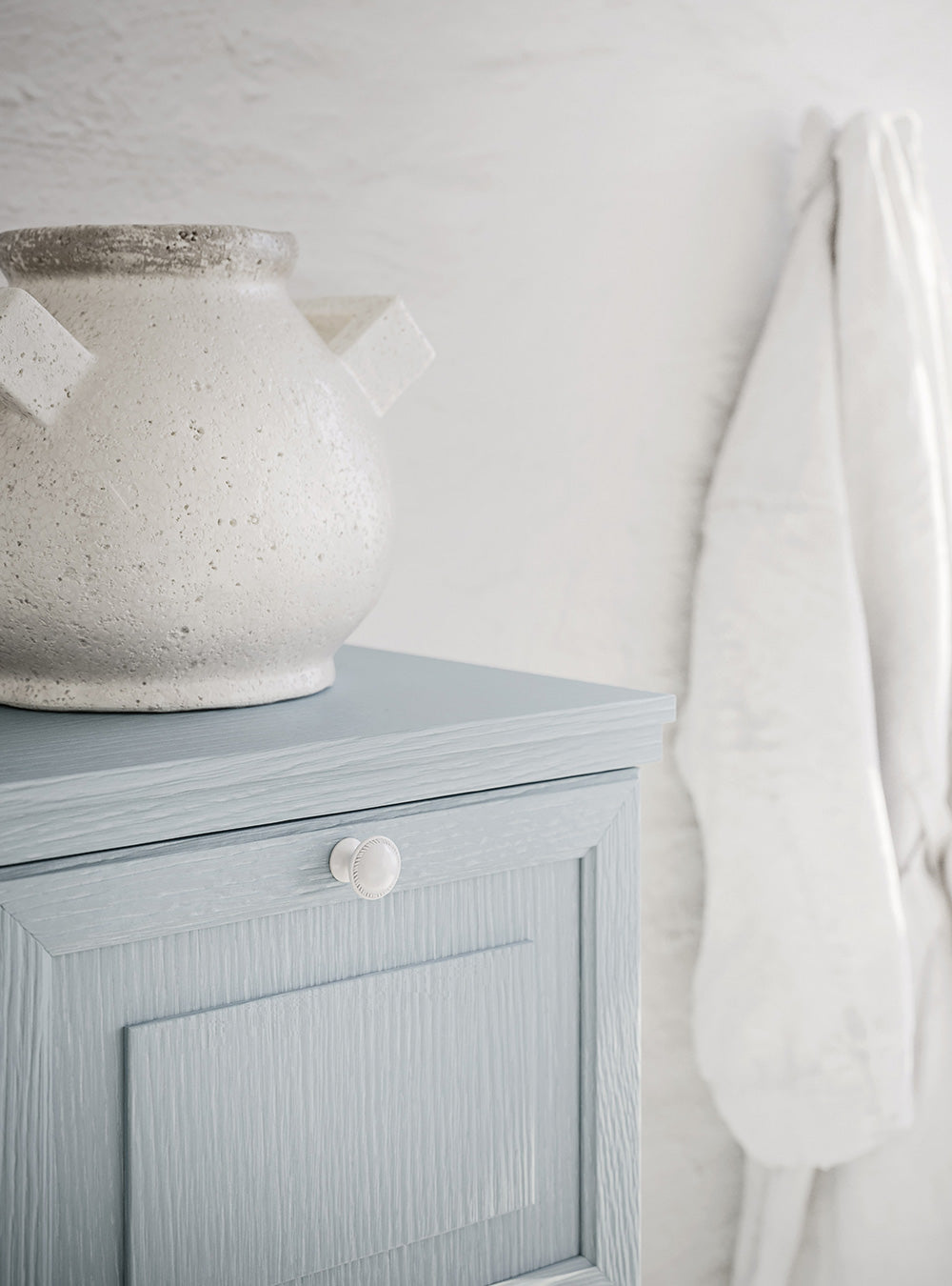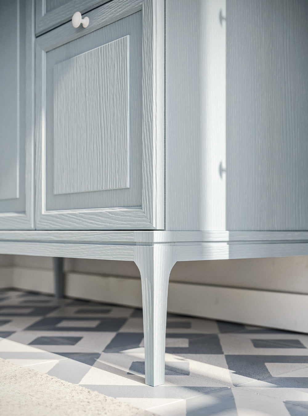 The Maison collection reinterprets past stylistic canons in a contemporary key, allowing us to relive the atmosphere of yesteryear with traditional bathroom furniture. The solid wood veneer framed door, plinth and molded legs are the signature elements of this collection, available in various pastel ash finishes. The shabby-chic style finds its expression in a multitude of elements that furnish every bathroom with class and style.