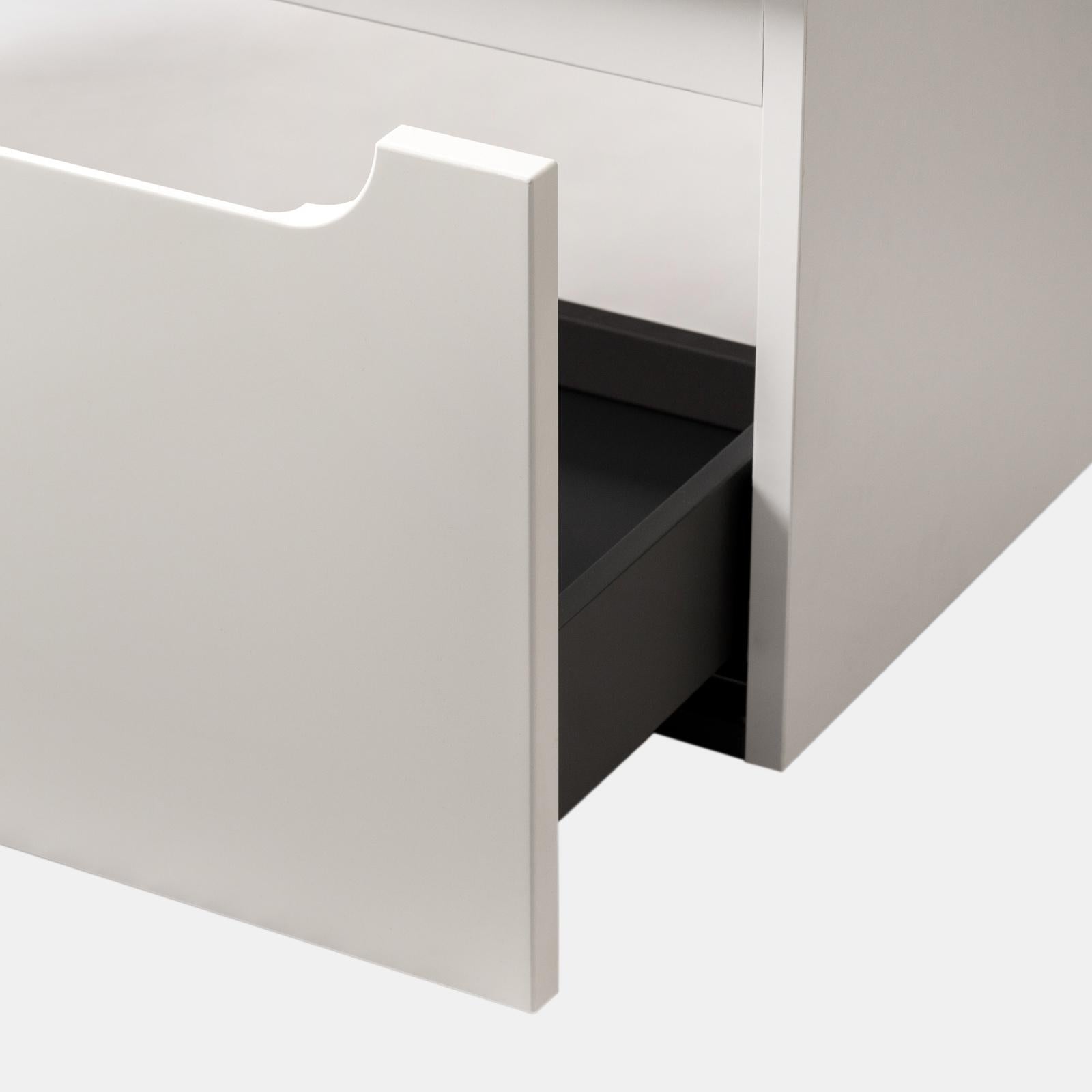 The inside of the drawer is finished in a monochromatic anthracite shade, the same used for the sides of the cabinet. This color choice creates a harmonious and modern aesthetic, giving visual continuity to the inside of the cabinet and a uniform and sophisticated look.