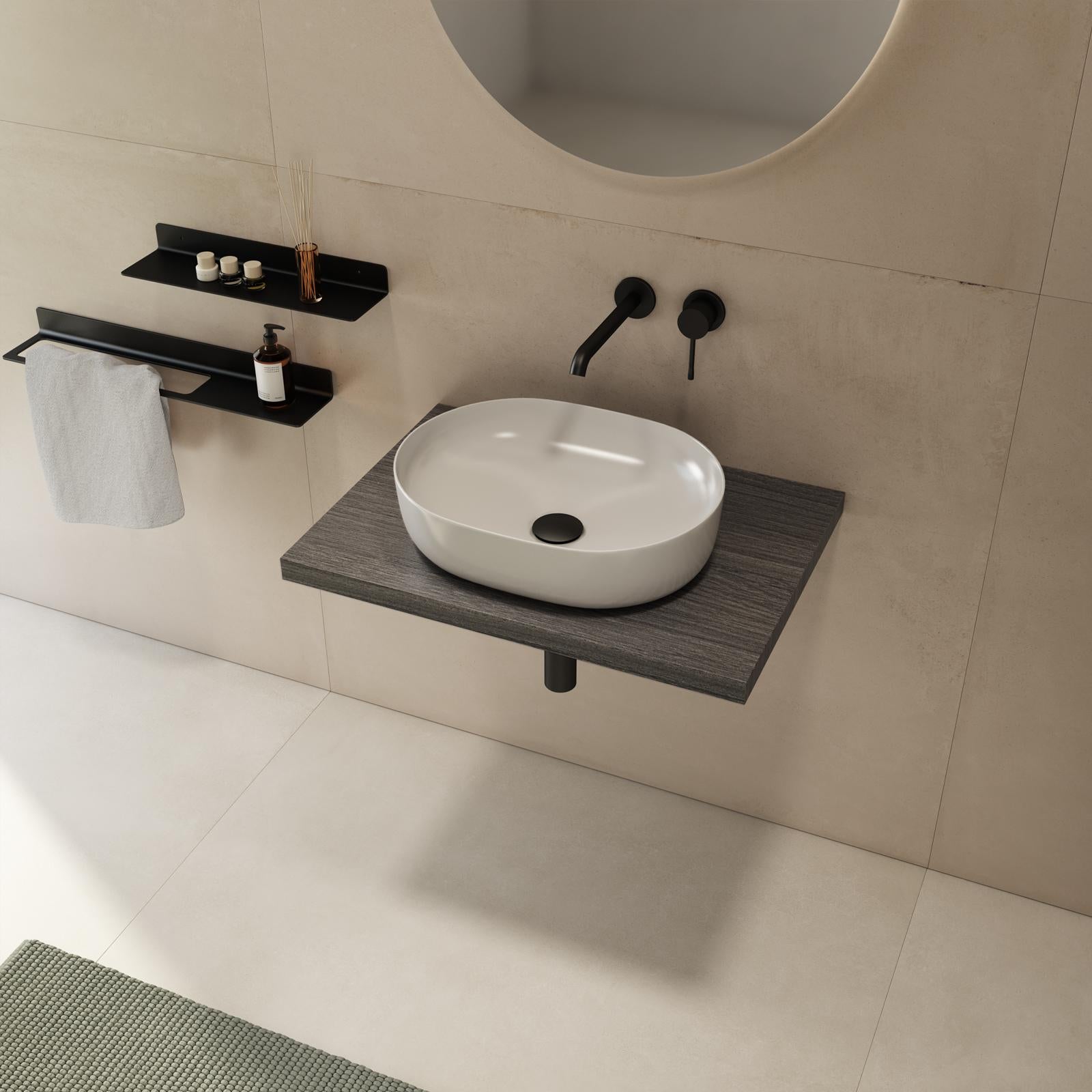 The Plain shelf is a compact and trendy suspended top for countertop washbasins. The suspended solution for your bathroom, ideal for optimal cleaning of the room, to furnish the bathroom with a modern design.