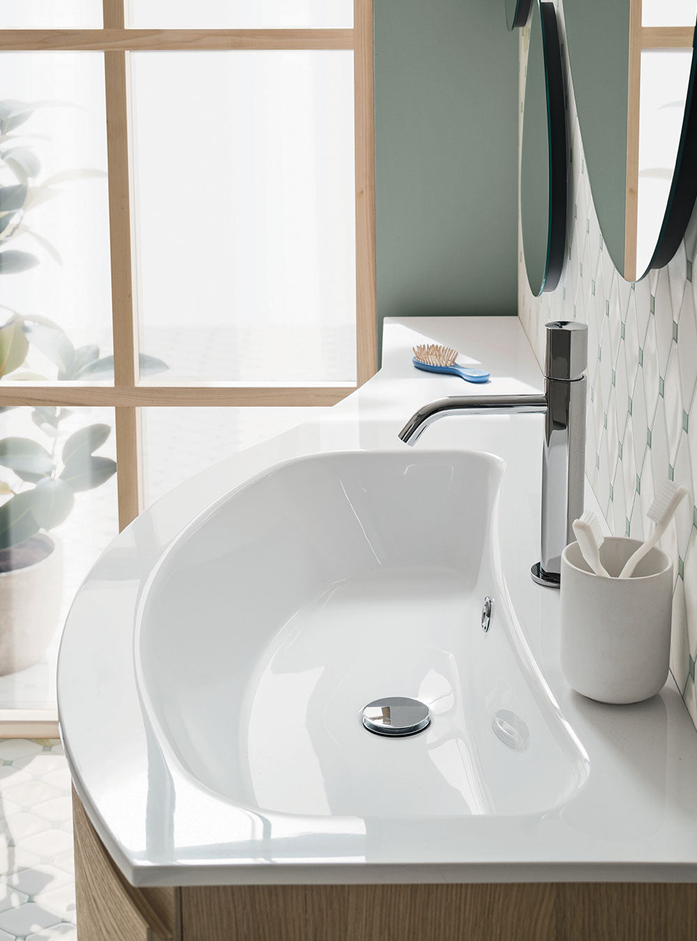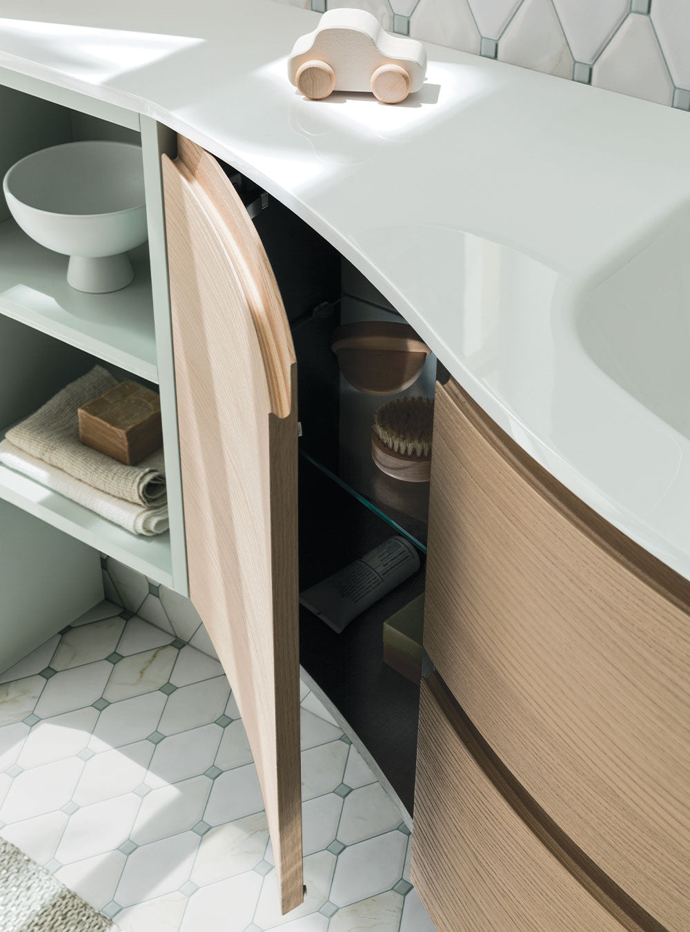 he defining feature of the Fusion complete bathroom is the curved line: a collection of designer units that combine the soft shapes of base units with the rigid geometry of tall units and open-faced units.