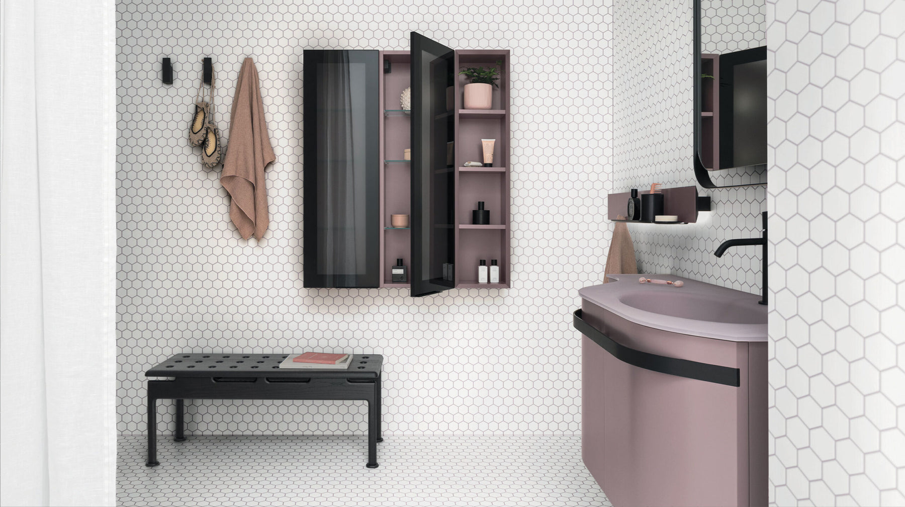 Fusion's defining feature is the curved line: a collection of designer units that combine the soft shapes of base units with the rigid geometry of tall units and open-faced units. Available in the new MOBY version with an unusual handle, the collection creates a previously unknown harmony in the bathroom with its soft shapes and refined combinations. Practical and functional bathroom furniture that creates a welcoming, calming atmosphere and that can be perfectly adapted to any style and personality.